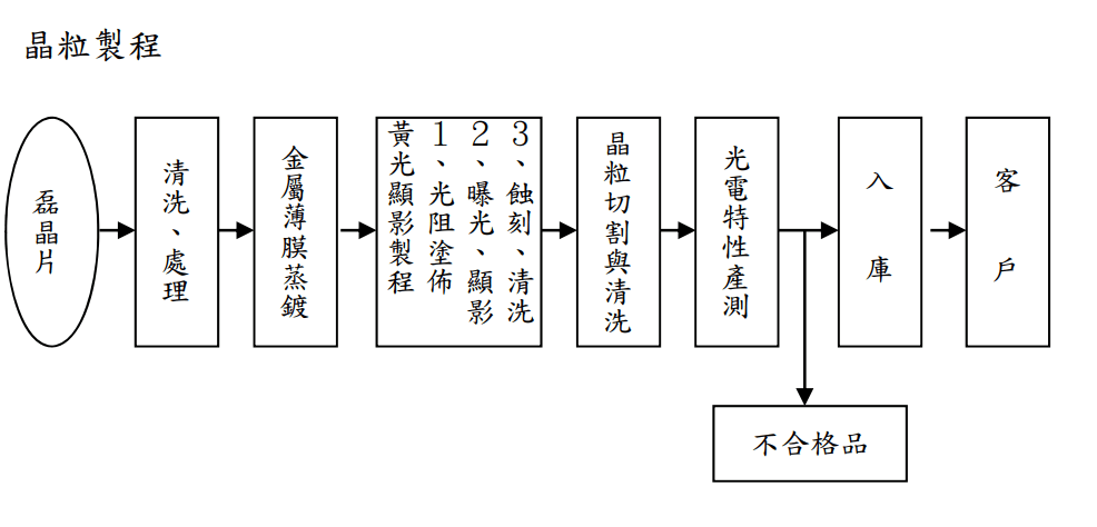 LED製程大抵與半導體製程類似,只是採用的晶圓並不相同,首先磊晶廠如晶電會向如兆遠、中美晶等買入藍寶石基板不同的半導體基板與外延片等,然後在基板上透過MOCVD化學製程長出磊晶片,在檢測其光電特性後完成磊晶製程,再透過磊晶製作晶粒,完成晶粒後到交給LED封裝,我們引用晶電的晶粒製程如下圖。
