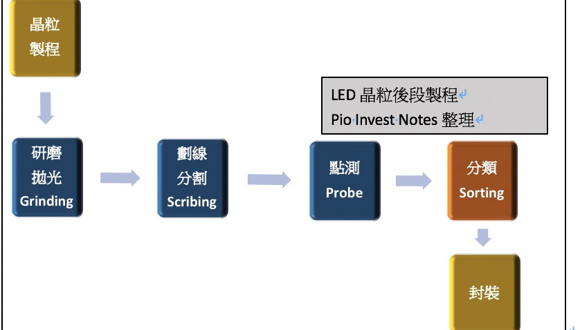 依照上表,從磊晶片進行針測、清洗處理,一直到完成黃光顯影製程的流程稱為晶粒的「前段」製程,而從切割、光電特性產測到入庫的流程,就是「後段」製程,在這些流程完成後,才會送到下游封裝。