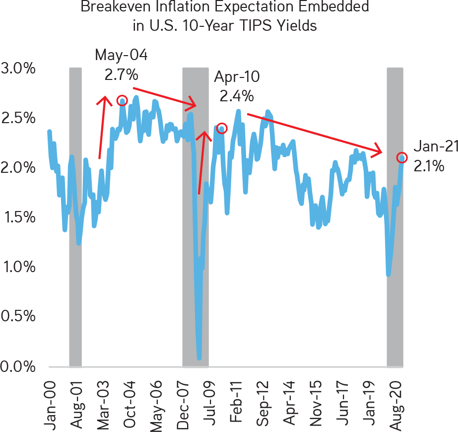 實際上在每個經濟復甦期的「初期」都會有最高的通膨預期。請見下圖,同樣的情況發生在2003/03與2009/06,通膨預期一度都大幅度攀升。