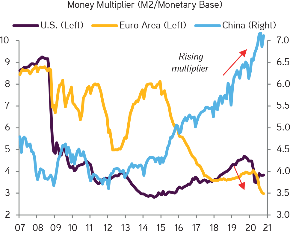 Fed與財政政策挹注很多的流動性,這將會對實體經濟造成影響,怎麼影響呢?我們可以觀察貨幣乘數,以UBS分析M2的12個月增量減去過去5年平均量的數字來觀察,截至11月底來說,美國的貨幣乘數目前看起來還在低檔(中國的貨幣乘數卻有很高的數字。)