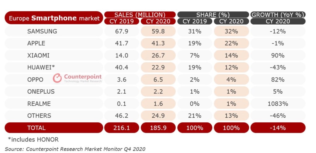 另外值得注意的是,隨Apple新手機推出,2020第四季Apple的歐洲市場佔有率31%超越SAMSUNG的28%,