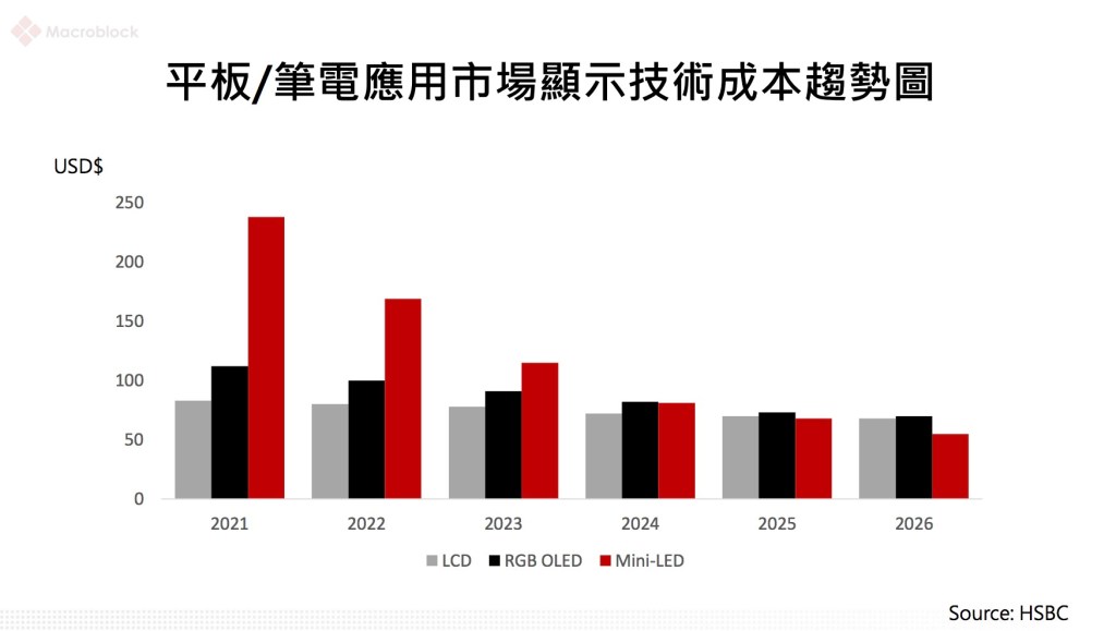 以上大多是Mini Led在中小尺寸的手持產品的進展,根據聚積法說,Mini Led在13″~17″的中型顯示器應用在2021將成長10%,更大的成長在中大尺寸的部分,市場預估2021~2026中大尺寸mini led背光應用的CAGR是60%,而在2024年,Mini Led與Oled在中型顯示器的成本將會形成交叉點(如下圖),並在2026起Mini Led的成本更低於LCD。