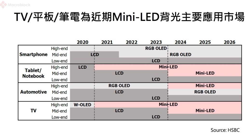 而在應用上,Mini Led將會在2024年起滲透到中階NB、平板與電視市場(如下圖)。