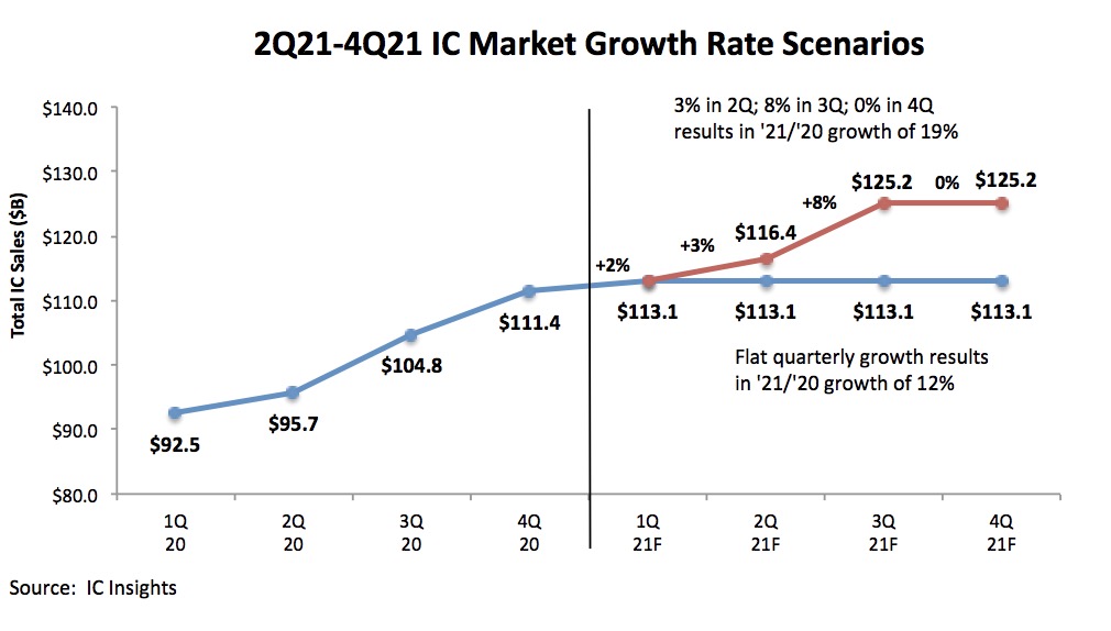 IC Insight依據40家IDM廠與50家IC設計公司的1Q21展望,認為1Q21/4Q20將會出現整個產業的季度增長2%,這是自2011第一季以來首次在4Q與1Q之間出現季度增長。根據預估,1Q21整個IC市場銷售將達113Bn。