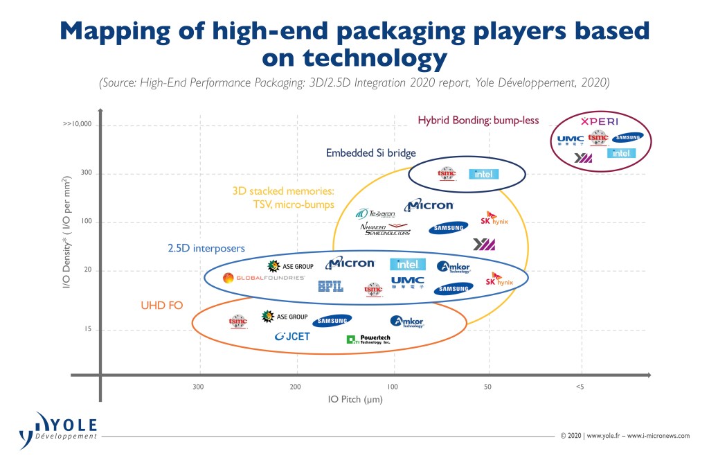 在後段封裝的領域,台積電與Intel的技術領先,根據Yole的報告,3D SoC, 3D stacked memory, 2.5D interposers, UHD FO, embedded Si bridge具有很高的潛力,3D SoC的技術以混合鍵合技術(Hybrid Bonding)為主,具有最高IO密度與最低的IO,參與者除了XPERI是IP公司外,幾乎都是晶圓廠,這可以單獨用來生產3D IC,Intel這一塊的技術應該稱為Foveos,而台積電以CoWos挑戰Foveos。