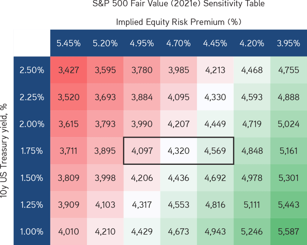 根據KKR的報告預估,依S&P 500的估值來看,假設10yr國債利率維持在1.75%的情況下,隱含風險溢價在4.45%~4.95%間股市約略還有一些上漲空間,依照目前4160左右指數價格來看,隱含風險溢價大概是在4.8~4.9%之間。