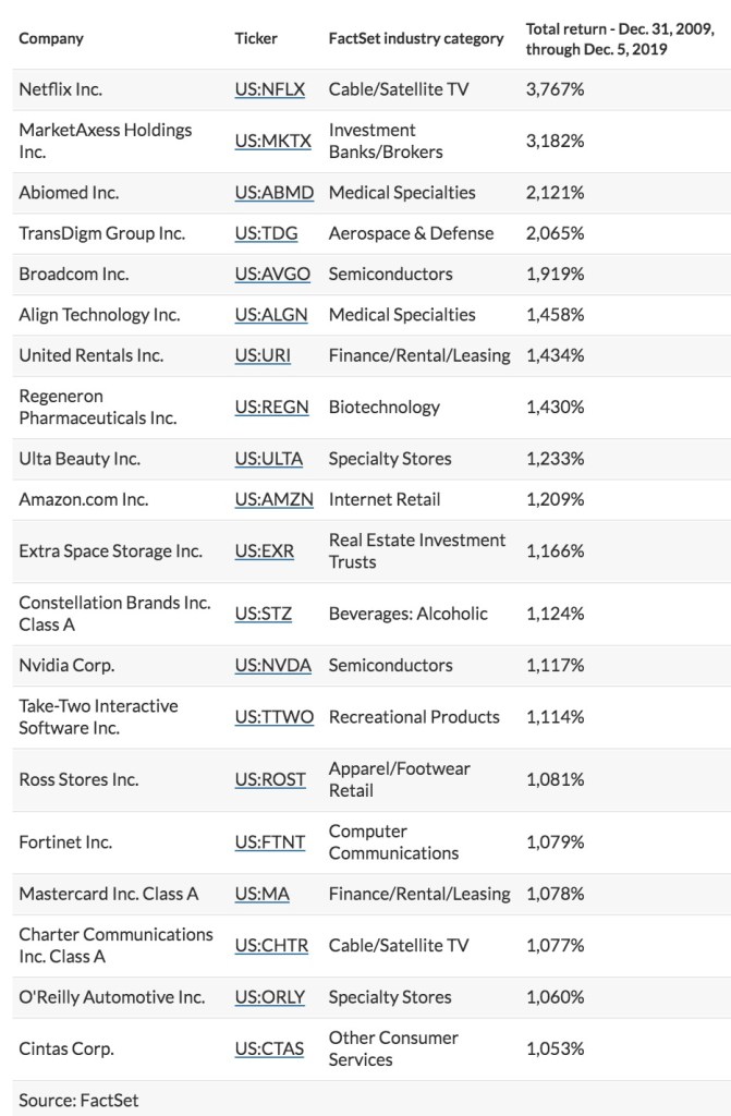 因為擔心2020年科技股大漲對排名的可能影響,這裡有一份榜單是2009~2019的前20名,剛好是上一次金融海嘯QE到疫情爆發前的榜單:
