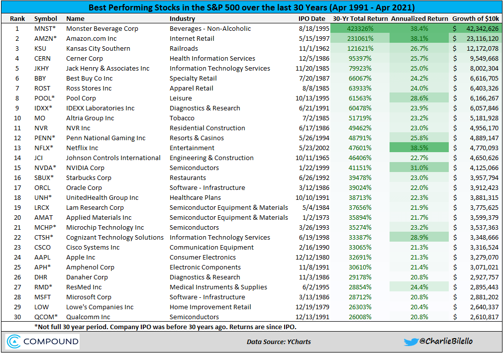 下面這張表很有趣,這是S&P 500中的股票在1991~2021年報酬最佳的前30名,第一名是Monster Beverage,就是我們熟知的能量飲料品牌,自1995上市後至2021報酬率423,326%,年化38.4%,投資1萬美元至今會變成4,234萬美元,第二名是Amazon,報酬率231,061%。除了這兩家,年化報酬超過30%的還有Netflix與Nvidia,大家常常提到的Apple、Microsoft反是在這榜單的24與28名。
