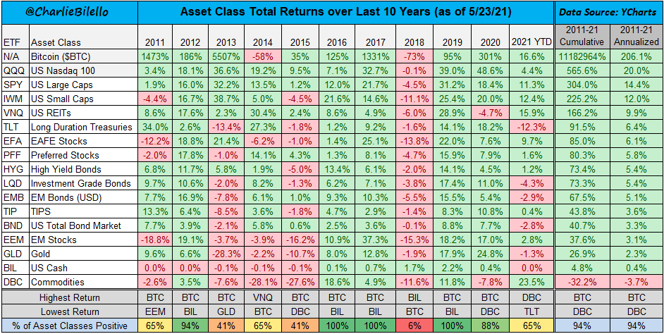 這裏我分享一張自2011年至今的統計,如果以不同標的的ETF來說,自2011~今年5/23的統計,年化成長幅度最高的是比特幣BTC,次之是以科技股為主的Nasdaq 100,年化報酬率分別是206%與20%,以商品為主的DBC是最差的,甚至比美金的報酬率更差,年化是-3.7%。