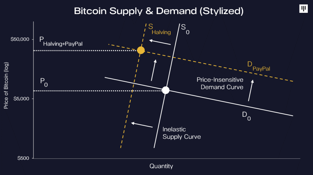 我承認這不是任何具有理論架構的估值方式,唯一有可能的關係來自比特幣供給限制與使用人數增加的反向關係,如下圖,比特幣的需求上升,供給限制下將會使價格產生變動。