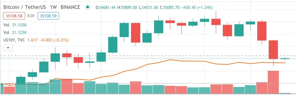 可以看下表,K線是比特幣的日線,橘色線是10年期國債利率。