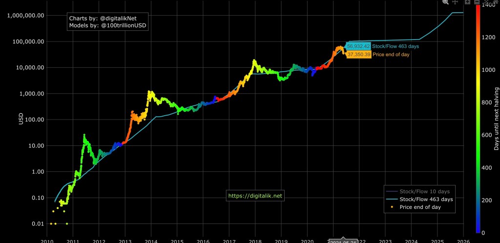 由於比特幣的年增量基本上幾乎可以預期,所以在SF模型下可以計算出比特幣的長期價格,2021年年底的價格是$85,618美元,而2025年12月預計會達到95萬美元左右(哇哇哇!!)
