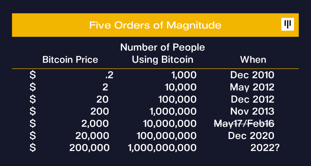 在上表中,Pantera認為比特幣使用人數每新增100萬人,價格上漲200美元,舉例2010到2013使用人數從100人,增長到100萬左右,價格從0.2變成200美元,2020時使用人數達到1億人,價格已經來到2萬美金,根據Pantera的推論,當人數達到10億時,則價格應是20萬美元。