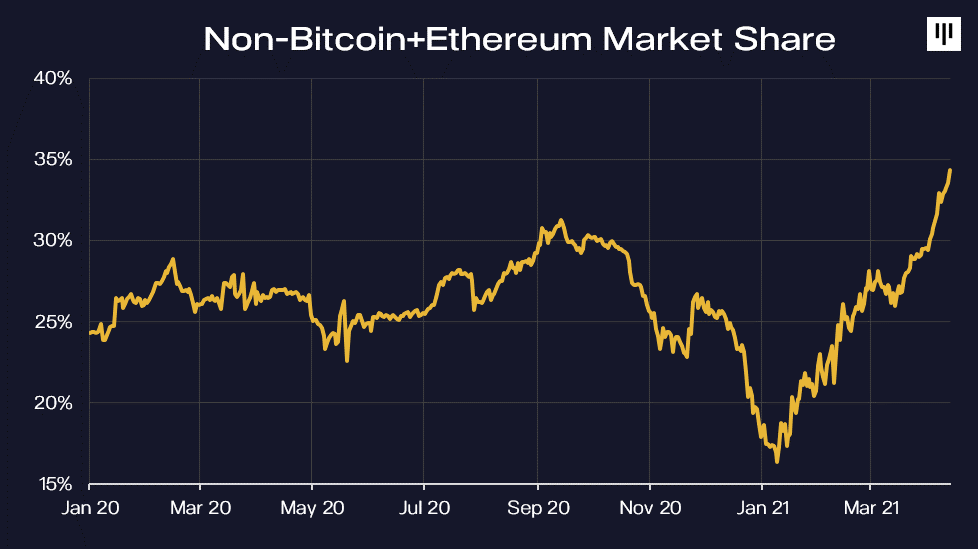 這是一個很有趣的市場,今年加密貨幣的熱錢幾乎要滿出來,也帶動其他小幣的市況,根據統計,非比特與非以太幣的市佔率逐漸攀高,有機會我會分享一下,怎麼看其他加密貨幣,