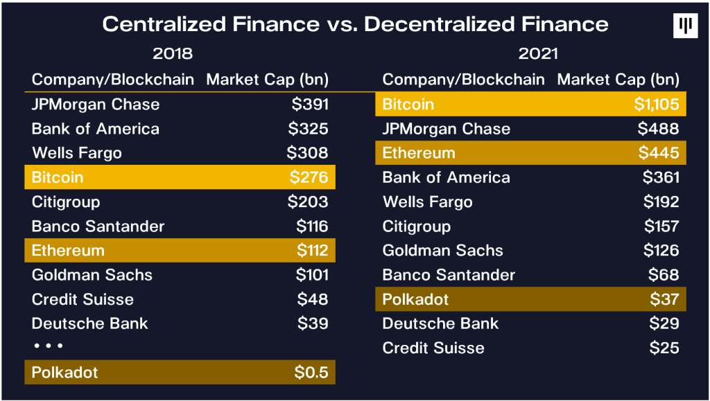 另外,想分享一下以太的狀況,作為加密貨幣中去中心化(DeFi)的底層架構,以太坊將引發非常多的金融創新,其市值也很接近JP Morgan(如下圖)。