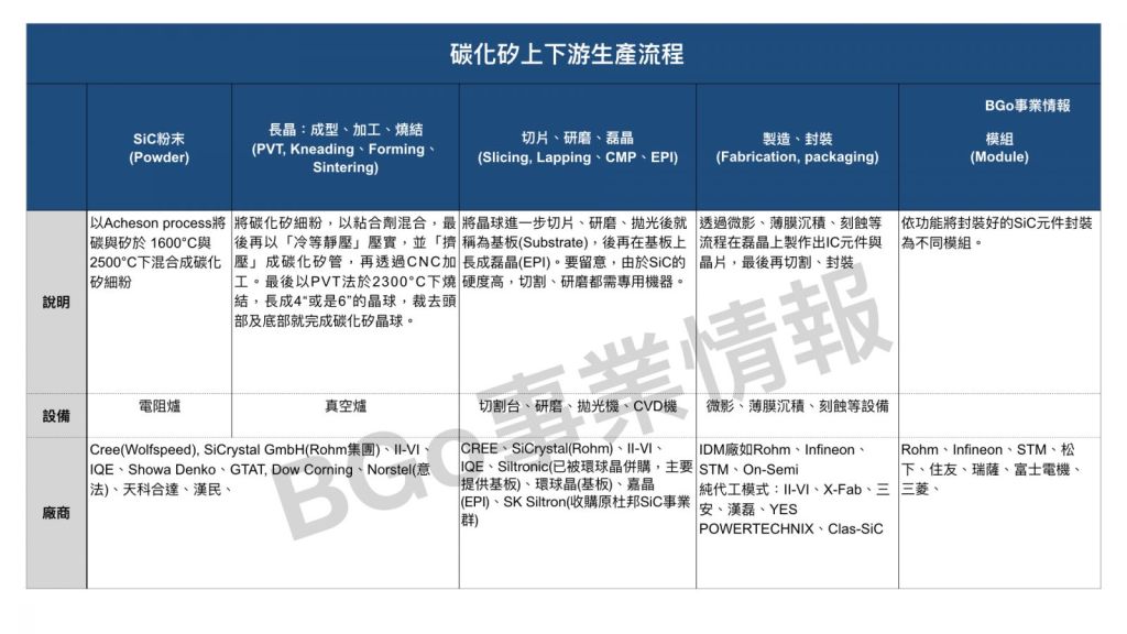 - 碳化矽基板/磊晶供應商:如CREE、II-VI、以及本次被收購對象GTAT,另外,也有一些晶圓業者,自身並無長晶產能,而是向上游購買碳化矽晶球後製成碳化矽基板或是磊晶,如環球晶,或是購入基板製程磊晶如嘉晶等。這部分的瓶頸在於,市面上極少有碳化矽的「長晶設備」,如CREE、II-VI、GTAT等的設備都是自行研發。