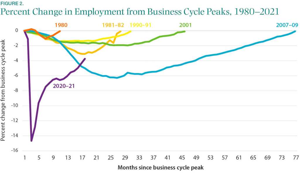 上圖比較過去幾次景氣循環時情境,在衰退發生第17~18個月時,2021年8~9月期距離原就業狀態仍有3~4%的Gap,僅優於2007~2009金融海嘯衰退週期,2001、1990~1991、1981~1982的的衰退在同時期已恢復至1~2%的Gap。