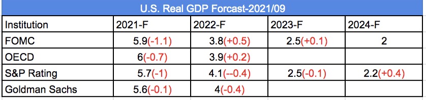 上表是9~10月份機構對美國實質GDP的修正,FOMC與OECD的調整邏輯是因變種病毒、供應鏈問題將今年成長遞延2022,表中尚來不及更新的10/12 IMF的預估更新,2021~2022分別是5.9%(下調0.1%)與4.9%,國際機構在2022都維持持平或遞延2021年成長率預估,但顯然標普與高盛認為成長下修的狀況將持續到2022年,並遞延至2023~2024年,暗示: