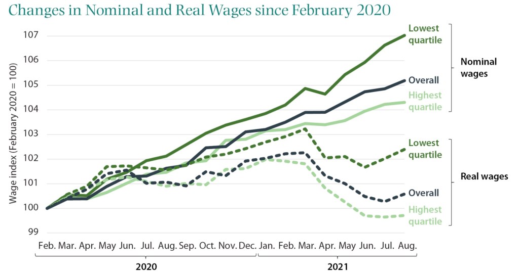 這個數字有機會嗎?先看看工資是否回到原本水準了?美國最低1/4的族群實質工資大約較疫情前年增1.6%,但2019年時最低1/4族群的工資年增率2.4%,仍有些微差距,目前普遍的預測是2022年Q1有可能創下3%的通膨率,對比之下名目工資成長增速較慢,加上疫情在冬天升溫可能、服務業復甦速度兩個因素,雖服務業復甦是必然,但對年底前就業數字每月70萬目標存疑。