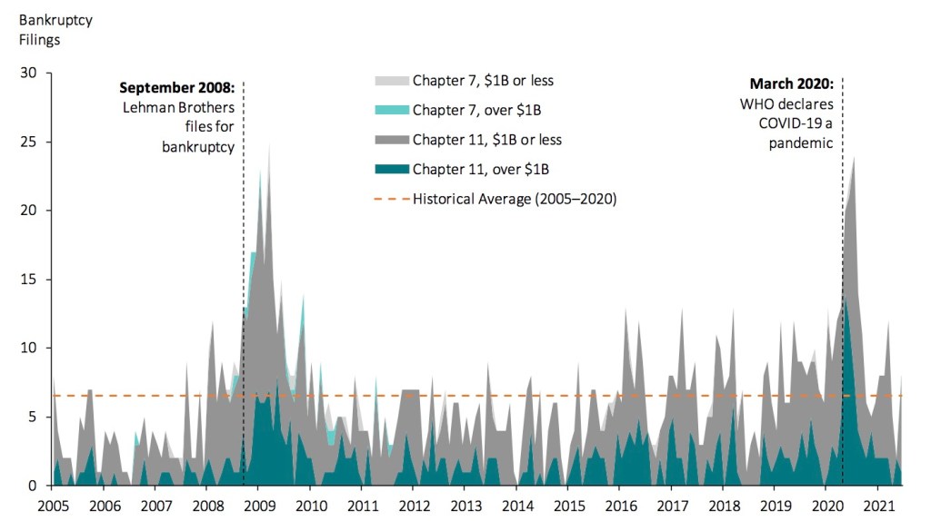 2021年至6月底的申請數已創新低,預計全年將創下2012年以來新低,可見下圖,Chapter 7(美國破產法第七章,破產清算)、以及Chapter 11(美國破產法第11章,破產重組)申請數在2020年中後就一路向下。