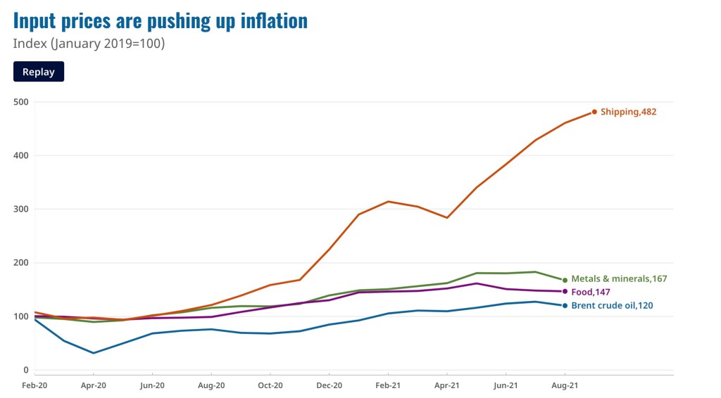 在OECD的報告中,自去年8月起高漲的運價是推升通膨的原因,當然還有其他因素例如耐用品如車用中的半導體,但跨產業來說面臨巨大的要素仍是運價的急漲。