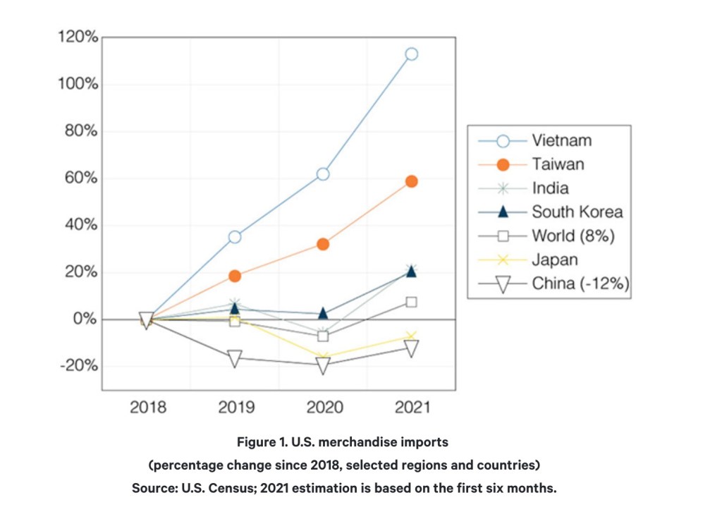 但從上表可以看到,自2019年起,美國進口國從中國移轉出來的部分主要是越南、台灣所吸收。這段時間以來,各產業在中國的消長也有明顯的變化,許多歐美零售業退出中國,例如家樂福、Tesco、Forever 21,也有一些廠商試著在海外複製中國的製造基地,例如台灣許多EMS大廠,只是這部分的遷移沒那麼快,而對某些廠商來說,中國除了扮演製造要角外,也是重要的市場,例如Apple與Nike等,這些廠商的短期策略是第三地出口後再轉出口回美國避開關稅,但中長期而言,也在尋求中國以外的生產基地,而影響最大的預估就是晶片廠,美國晶片廠有很大的營收來自中國廠,美中貿易引發正中國晶片自主化的趨勢,阿里巴巴、百度近期都投資了中國的AI晶片廠飛騰,這波晶片缺貨潮也加速中國MCU的進口替代。