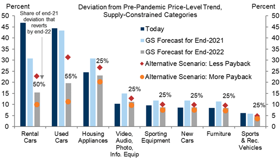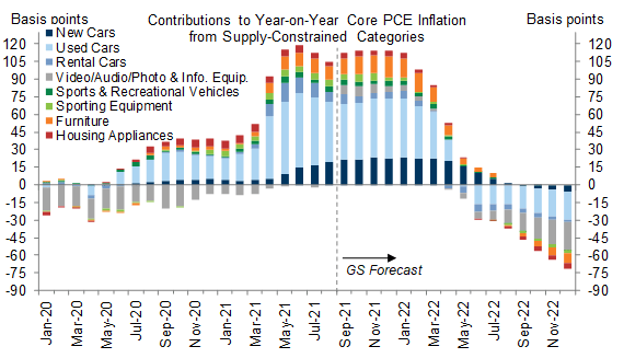 在目前Core PCE中,二手車、家具因供應鏈問題造成PCE大增的原因,如上圖。高盛預期在2022年時,首先是Video/Audio/Info等資訊用品的價格會先開始紓解,年中時二手車因新車供應鏈問題而解決,並預估在2022年年底時通膨將回到2%的水準。